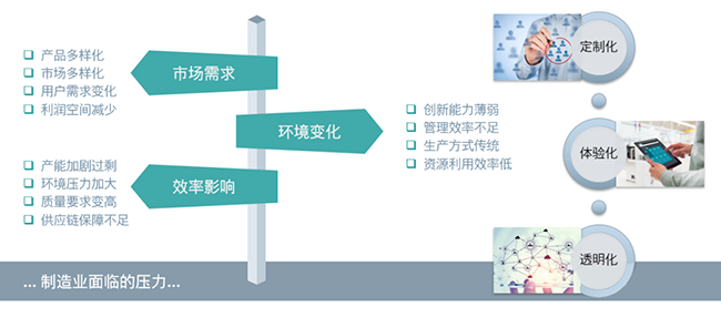 改革開放以來,中國制造加速融入全球產(chǎn)業(yè)鏈,隨著各行各業(yè)的快速發(fā)展,企業(yè)競爭也進入了新的階段。產(chǎn)品與市場的多樣化,需求變化多,產(chǎn)能加劇過剩,人力成本高企,環(huán)境壓力加大,供應鏈保障壓力大,都已經(jīng)成為了新常態(tài),企業(yè)普遍存在著創(chuàng)新能力薄弱、管理效率不足、生產(chǎn)方式傳統(tǒng)等困擾,并且客戶對于服務(wù)的期望水平也越來越高,希望有更多的定制化產(chǎn)品、透明化與體驗化的服務(wù)過程與此同時,在數(shù)字化高度發(fā)展的新時代下,客戶獲取的信息渠道廣泛,其偏好與重點也在頻繁變化。企業(yè)需要把關(guān)注點從"產(chǎn)品"轉(zhuǎn)向"客戶",把以客戶為中心的企業(yè)運營作為企業(yè)發(fā)展過程中的思考與行為中心。